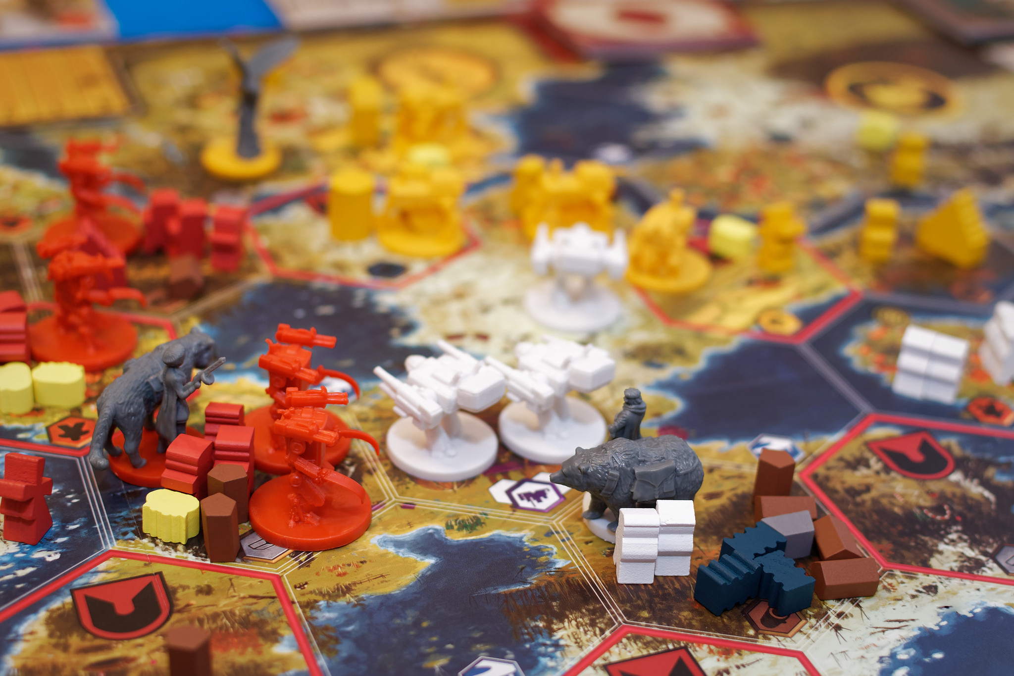 The idea for a five-player team reflects the number of teams participating. Each team should have the planning capability to observe each other team and predict their strategy (so-called red teaming (Red Teams 2018) leaving one player free for planning on the team’s strategy and receiving strategic advice from her team members. Any team member would become a subject matter experts (SME) in a particular domain, either as a red teamer for another faction and maybe also in a specific area of the game mechanics. The facilitator left the teams alone to self organize as they saw fit. A seminar with five teams results ideally in 25 participants (5 x 5 = 25). A seminar with four teams would be suitable for 16 participants (4 x 4 = 16). Scythe has five factions in the base game and two additional factions in the first extension available. Thus, one could facilitate the seminar with up to 49 participants (7 x 7 = 49).