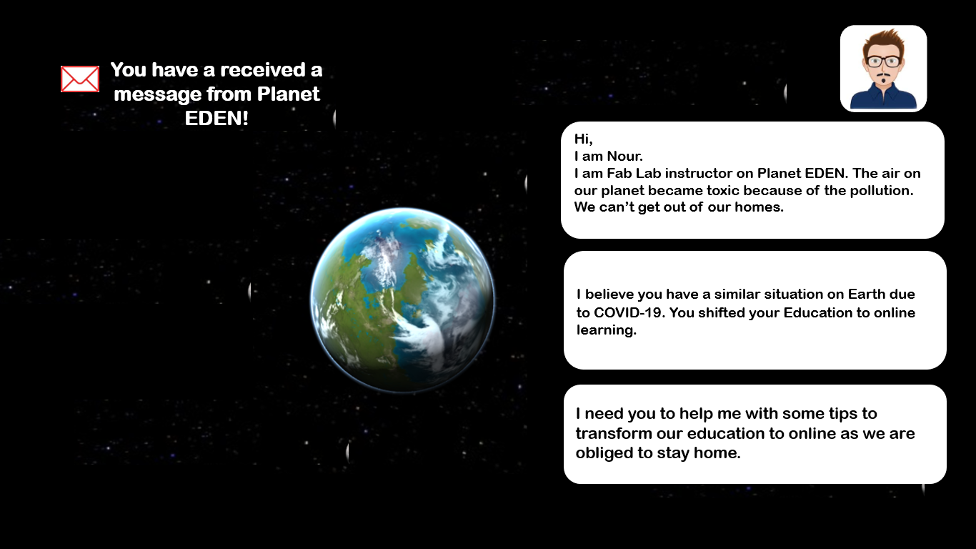 Once upon a time, an engineer ‘Nour’ from the future was faced by a huge challenge where the air pollution forced humans to stay home as the air became no more breathable. As an engineer in a Fabrication Laboratory (Fab Lab), all his work and teaching was based on hands-on projects and interactions. He kept wondering how he can transform teaching digital fabrication to a virtual platform while keeping the quality of learning process and the hands-on skills. An idea popped up in his mind to send a message to the past, to year 2020 in specific. He knew 2020 was the pandemic year where humans faced the same challenges in Fab Labs. He decided to send his message to my Fab Lab as it had a significant experience during this period…