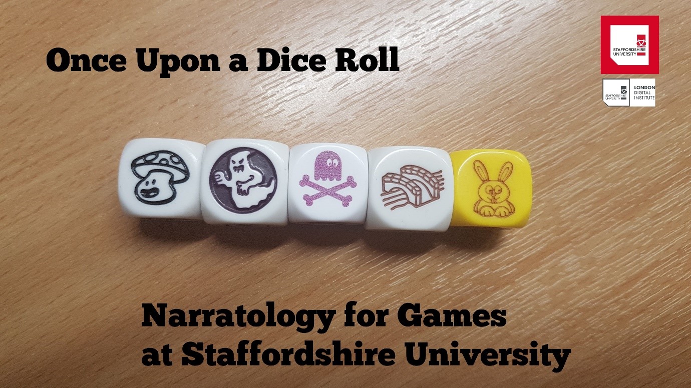 The first year Narratology for Games module has, as many long standing and ever-evolving programmes do, had an interesting history of being split, merged, moved around and eventually settled into its slot as a popular optional choice in the raft of first year choices. It’s also a work horse of a module combining analysis, friendship forging, narrative theory, academic writing and in recent years TWINE game construction. Our students come from a wide range of backgrounds, and prior experiences so there’s no suggestion of any pre-built in knowledge in any of the spheres the modules encompasses so we start from scratch, and in this modules case we start with dice.