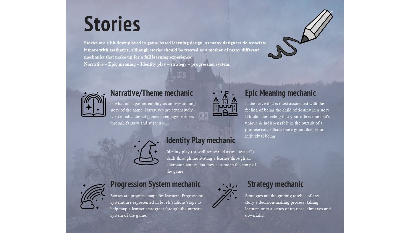 Nevertheless, Stories are a bit downplayed in game-based learning design, as many designers do associate it more with aesthetics; although stories should be treated as a mother of many different mechanics that make up for a full learning experience: