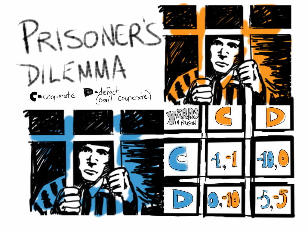 In the game, there are a number of assumptions which have to hold in order for it to play out as it does. The players are ‘rational actors’. Prisoners have no way of rewarding or punishing each other, other than the prison sentences. Furthermore, their future reputation is unaffected by the single decision they make. Under these assumptions, betraying a partner offers a greater reward than cooperating with them, and therefore rational actors will always ‘betray’.