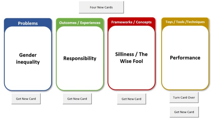 At the moment this game is set up with a list of themes, which are ‘wicked problems’, such as Climate change.  As the game is implemented as an Excel spreadsheet, the card contents are merely lists in a sheet, referenced by VBA code which allows you to reference specific cards or randomise your choice, turn over cards which have two sides and so on.